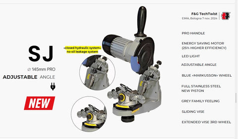 The new Tecomec Super Jolly EVO chainsaw chain grinder features a closed hydraulic system with no oil leaks, an automatic 3-point chain vise, and a tilting vise for chisel chains. It offers easy pitch adjustments, sharpens chains from 1/4" to 3/4" pitch harvester chain. The grinder comes with three grinding wheels, a dressing brick, wheel gauge & template.